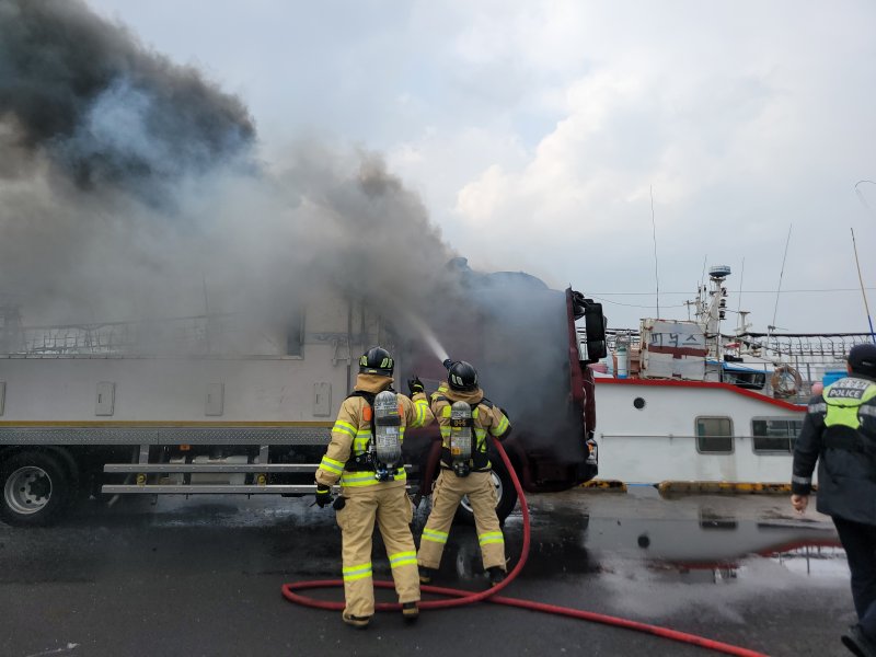 (제주=뉴스1) 고동명 기자 = 1일 오전 11시 41분쯤 제주시 제주항 2부두에서 5톤 활어차에 불이 났다는 신고가 119에 접수됐다.