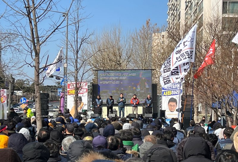 김광창 서비스연맹 위원장은 연단에 올라 "쿠팡은 10여년간 택배노조의 피와 땀을 바꾼 귀중한 노동기준을 하나하나 박살 내고 있다"며 "쿠팡의 365일 배송시스템을 깨는 것이 변화의 시작"이라고 주장했다.