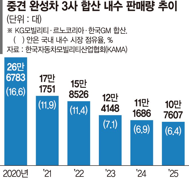 이는 국내 완성차 시장에서 현대차·기아의 존재감이 커진 영향이다. 현대차는 지난해 국내에서 71만2959대를 판매했다. 수입차 선호 현상이 확대된 것도 중견 3사의 영향력을 끌어내리고 있다. 한국수입차자동차협회(KAIDA)에 따르면 지난해 신규 등록된 수입 승용차는 30만7377대로 집계돼 수입차 시장이 열린 1987년 이후 처음으로 30만대를 돌파했다.