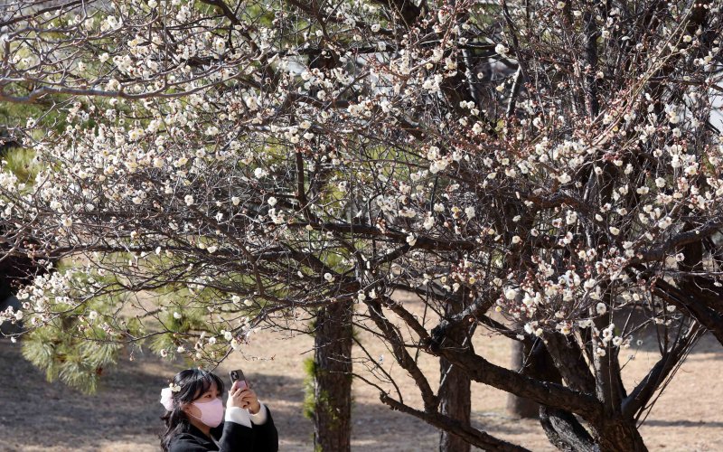 [부산=뉴시스] 하경민 기자 = 절기상 입춘(立春)을 사흘 앞둔 1일 부산 남구 동명대학교를 찾은 한 시민이 활짝 핀 '봄의 전령' 매화를 휴대전화로 촬영하고 있다. 2026.02.01. yulnetphoto@newsis.com [서울=뉴시스]김진아 조성우 하경민 오영재 기자 = 2월의 첫날인 1일 평년 기온을 회복하며, 낮 기온이 7도까지 오르는 등 대체로 맑은 날씨를 보였다.