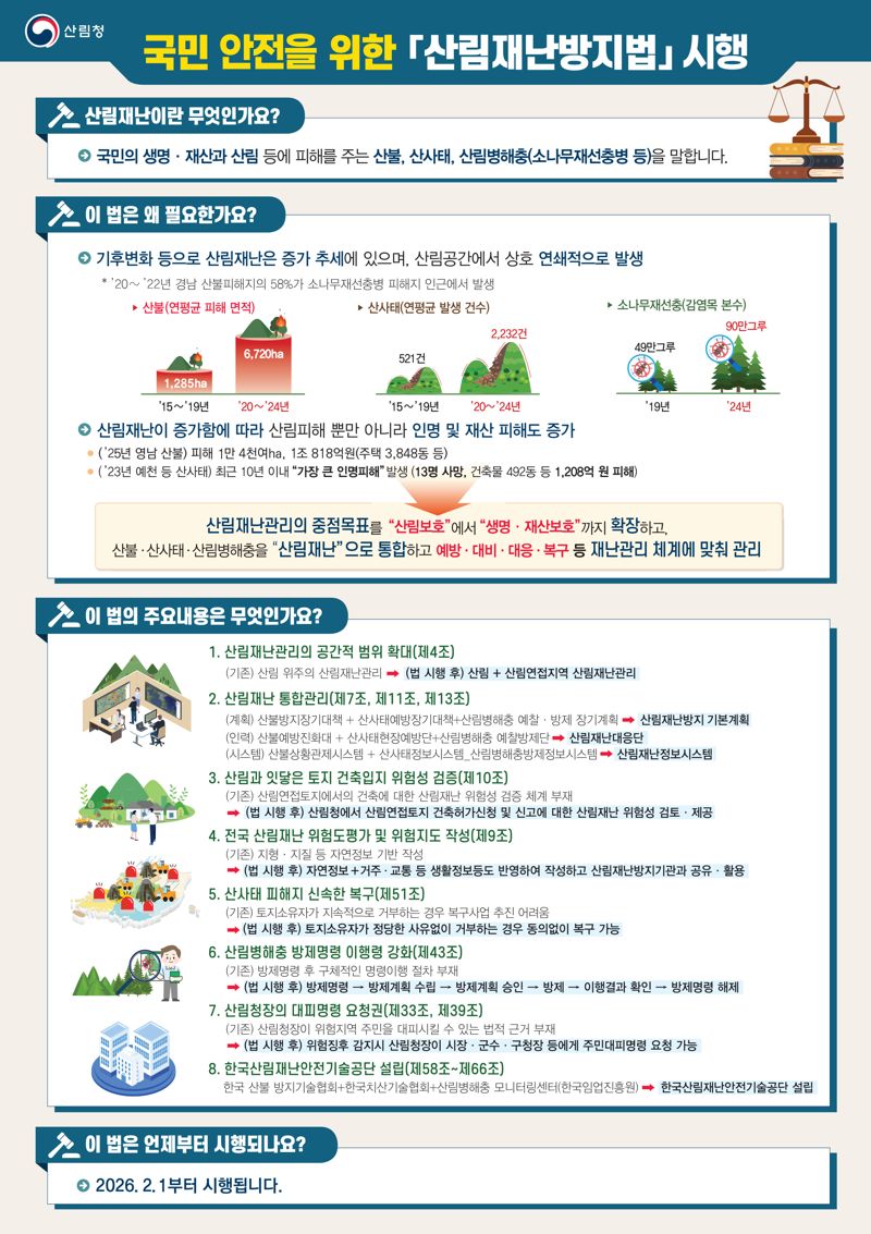정부는 이러한 기후위기에 따른 산림재난을 통합·효율적으로 대응할 수 있는 법적 기반 마련의 필요성을 인식하고, 국민의 생명과 재산 보호를 최우선 가치로 하는 ‘산림재난방지법’을 지난해 1월 31일 제정·공포했다.