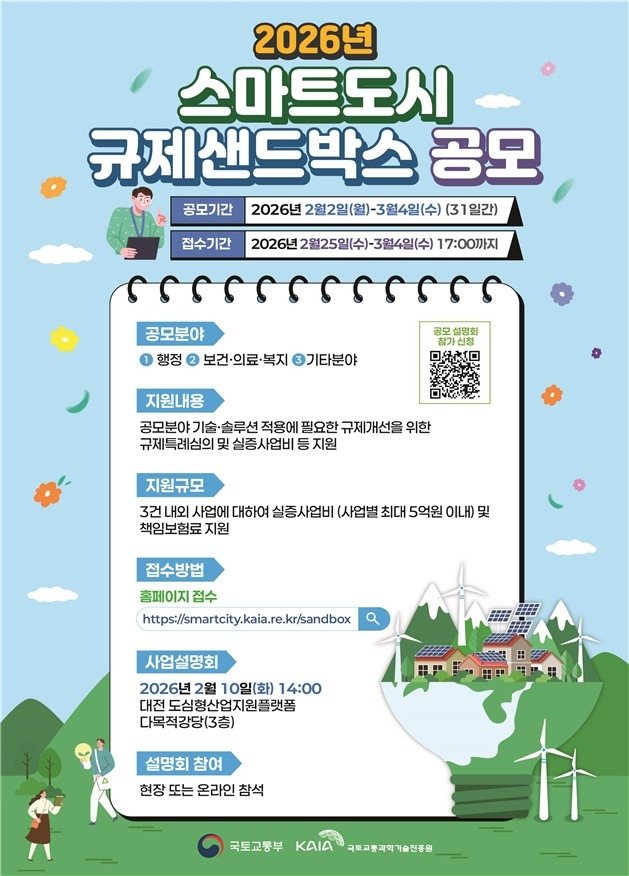 (서울=연합뉴스) 임기창 기자 = 국토교통부는 스마트 도시 기술·서비스의 규제 완화와 해소를 지원하는 스마트 도시 규제샌드박스 실증사업을 공모한다고 2일 밝혔다.