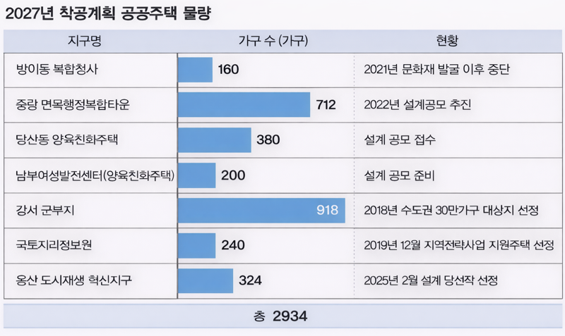 아이 키우기 좋은 공공주택으로 추진 중인 영등포구 '당산동 양육친화주택'도 일정이 불투명하다. 지난해 1차 설계공모가 공정성 논란으로 무산돼 재공모가 진행 중이며, 업계에서는 인허가 기간을 고려할 때 2027년 착공이 쉽지 않을 것으로 보고 있다. 금천구 시흥동 남부여성발전센터 복합개발 사업 역시 설계 공모 준비 단계에 머물러 있다.