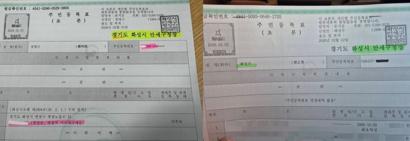 정 시장은 "화성에서 주민등록서류를 발급받으면 '구청'이 표기된다"며 "화성 4개 구청 시대 시작과 함께 가장 먼저 초본을 발급받았다"고 썼다.
