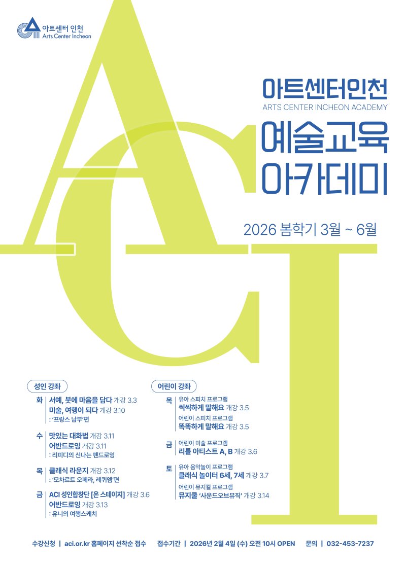 모든 프로그램은 봄학기 주 1회씩 10~12주간 진행되며, 수강 신청은 이달 4일 오전 10시부터 아트센터인천 홈페이지에서 가능하다. 자세한 일정과 수강료는 홈페이지에서 확인 가능하다.