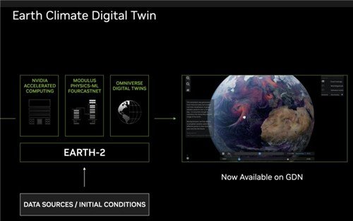 엔비디아는 기후 디지털 트윈 플랫폼 '어스-2(Earth-2)'와 생성형 AI 모델 '코디프(CorrDiff)'를 결합해 태풍의 경로와 홍수 피해를 정밀하게 예측하는 서비스를 선보였다.
