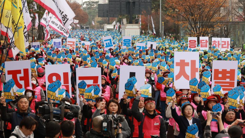 이어 "교육현장을 멈춰 세우는 책임은 노동자에게 있지 않고 교육 재정, 예산 문제라는 허울뿐인 말 뒤에 숨어 차별을 고착화해 온 교육 당국에 있다"며 "차별을 끝내고, 공정한 기준을 세우고, 학교 현장을 지탱하는 노동의 가치를 바로 세우기 위해 연대회의는 결코 물러서지 않을 것"이라고 강조했다.