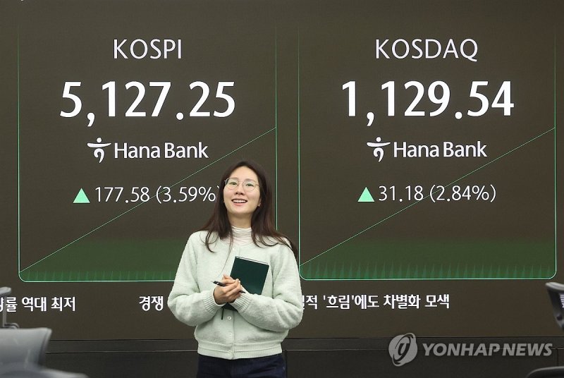 지수는 165.14포인트(3.34%) 급등한 5,114.81로 개장한 이후 한때 5,176.15까지 치솟으며 완만한 상승 흐름을 지속 중이다.