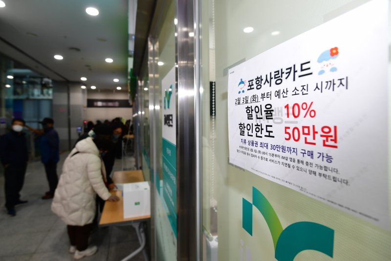 (포항=뉴스1) 최창호 기자 = 경북 포항시가 설을 앞두고 골목상권과 지역 경제 활성화를 위해 포항사랑상품권의 10% 할인 판매에 나선 3일 금융 점포마다 종이 상품권을 구입하려는 시민들로 북적거렸다.