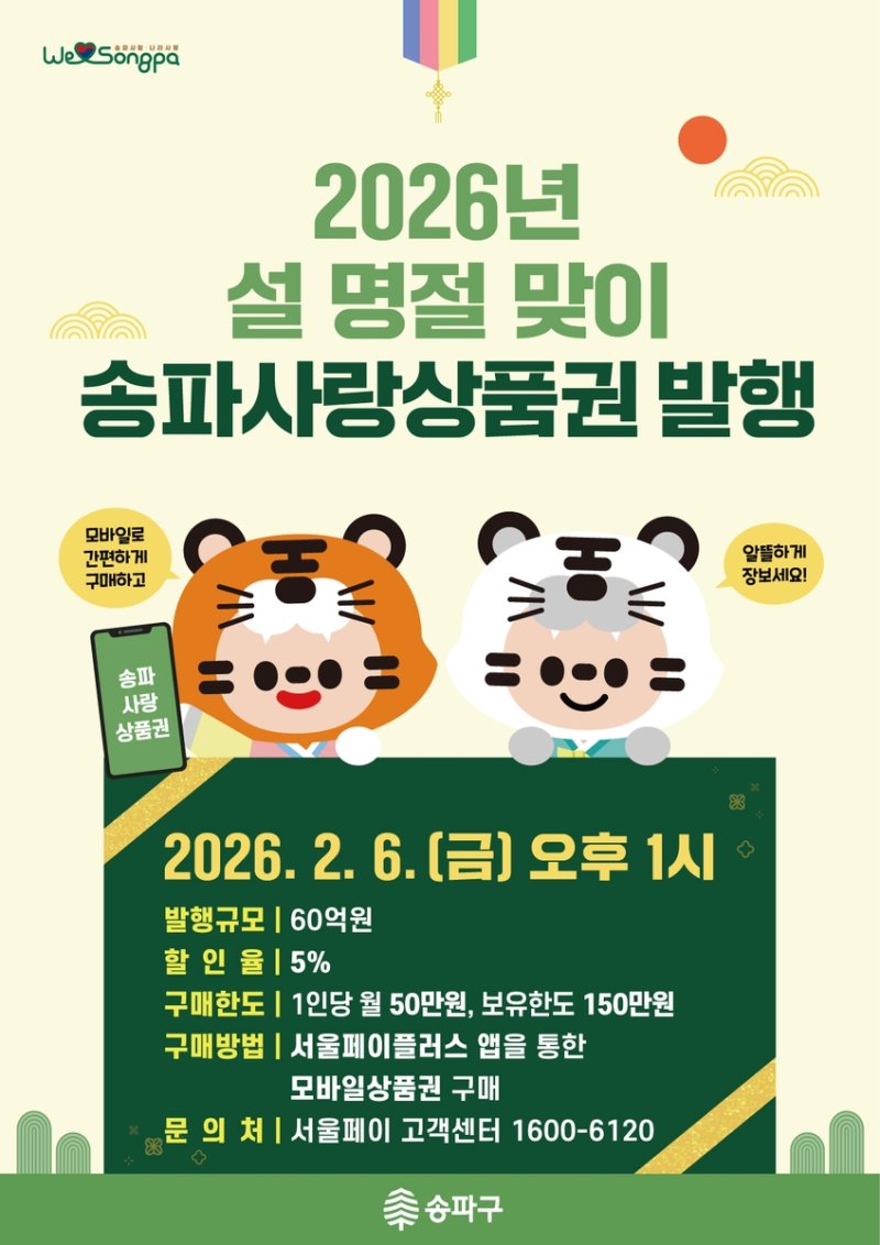 (서울=연합뉴스) 정수연 기자 = 서울 송파구(구청장 서강석)는 설 명절을 맞아 '송파사랑상품권'과 '송파땡겨요상품권'을 발행한다고 3일 밝혔다.