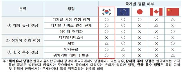 보고서는 해외 유사 쟁점으로 디지털 시장 경쟁 정책(EU 디지털 시장법(DMA), 한국 온라인플랫폼법 등), 디지털 서비스 안전 규제(EU 디지털 서비스법(DSA), 한국 정보통신망법 등), 데이터 현지화 등을 꼽았다.