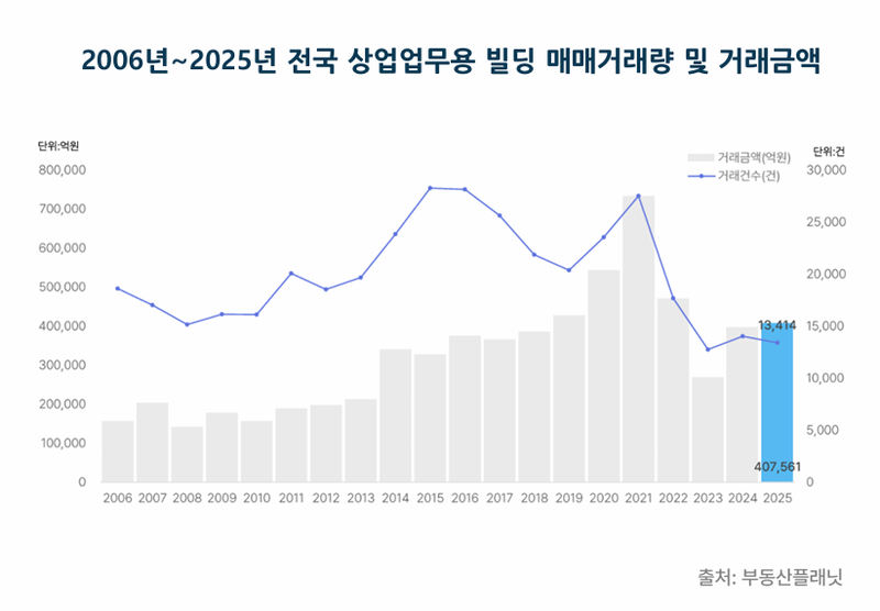3일 상업용 부동산 종합서비스 기업 부동산플래닛에 따르면 2025년 전국 상업·업무용 빌딩 거래량은 1만3천414건으로 전년 대비 4.4% 감소했다. 거래금액은 전년 대비 2.5% 증가해 40조7561억원을 기록했다.