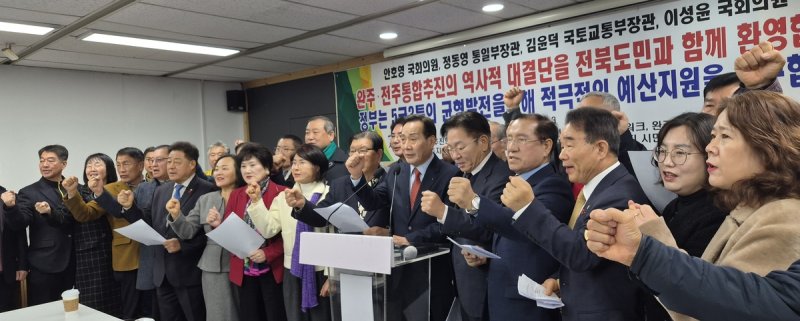 단체 회원들은 이날 전주시청에서 연 기자회견에서 "어제 안 의원의 결단으로 전북도가 전주·완주 통합시를 중심으로 지역발전의 탄탄대로를 열어갈 수 있게 됐다"며 "안 의원과 정치를 함께해온 완주군의원들도 원만하게 전주·완주 통합을 의결해 달라"고 호소했다.