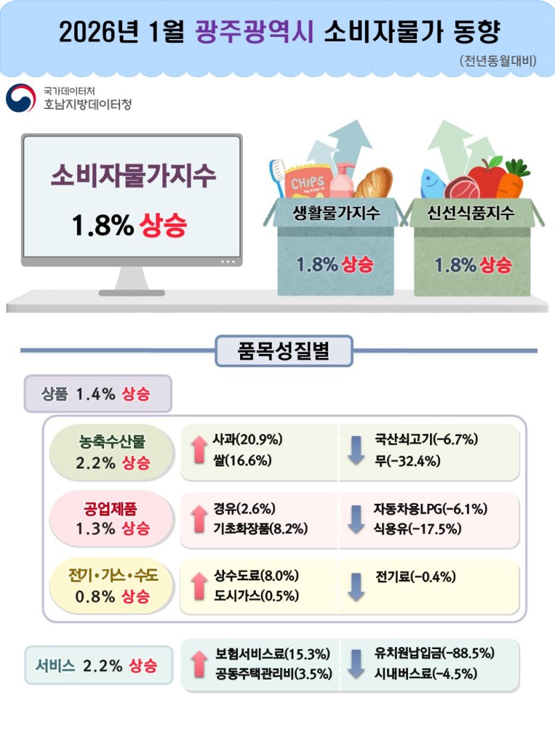 3일 호남지방데이터청의 1월 광주·전남 소비자물가동향에 따르면 지난달 광주 소비자물가는 지난해 같은 달에 비해 1.8%가 상승했다. 전국 평균은 2.0%다.