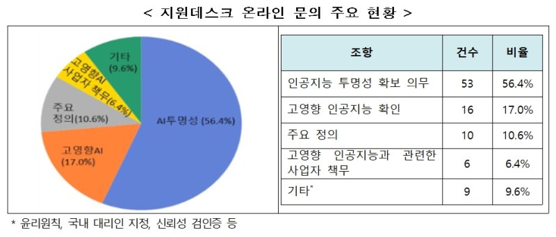 [서울=뉴시스]박은비 기자 = 인공지능(AI)기본법 시행과 함께 운영 중인 AI기본법 지원데스크에 접수되는 문의 중 'AI 투명성 확보' 관련 내용이 가장 큰 비중을 차지하는 것으로 나타났다.