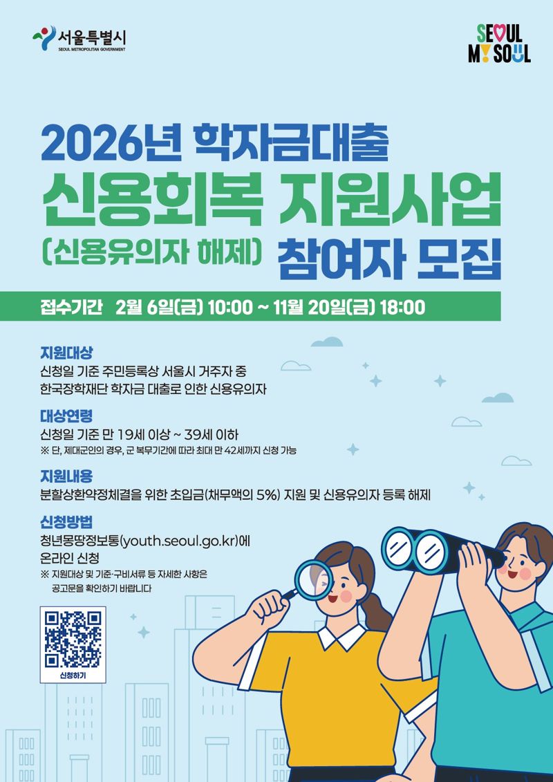 한국장학재단 학자금 대출로 인해 신용유의자로 등록된 서울 거주 19~39세 청년은 오는 6일 오전 10시부터 11월 20일 오후 6시까지 청년 몽땅 정보통 누리집에서 신청하면 된다. 단, 이미 서울시 또는 타 기관에서 유사 사업 지원을 받은 경우 지원 대상에서 제외된다.
