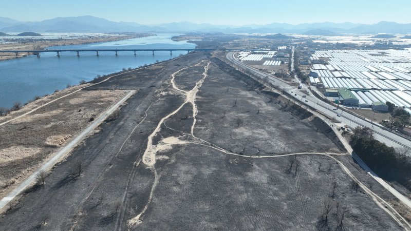 [창원=뉴시스] 지난 2일 오후 경남 창원시 의창구 대산면 일동리 수산대교 아래 갈대밭에서 불이 나 갈대밭이 시커멓게 소실돼 있다. (사진=창원시 제공) 2026.02.03. photo@newsis.com *재판매 및 DB 금지 [창원=뉴시스]강경국 기자 = 경남 창원시는 장금용 시장 권한대행이 대산면 수산대교 인근 갈대밭 화재 현장을 방문해 지난 2일 발생한 피해 상황을 점검했다고 3일 밝혔다.