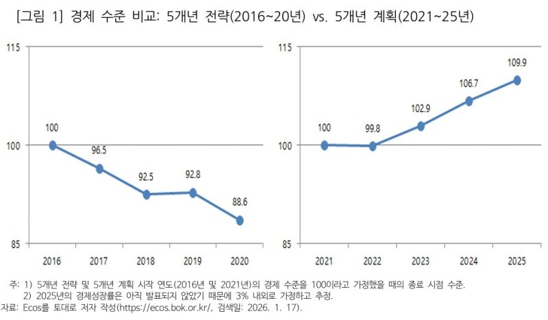 이 선임연구위원은 북한의 2021년 경제 수준을 100으로 두고, 2025년 성장률을 3%로 가정할 경우 2025년 경제 수준은 약 109.9가 된다고 분석했다.