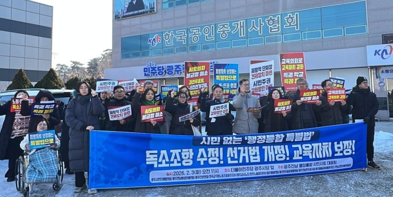 광주시민단체협의회 등 11개 단체가 모인 '자치분권 행정통합 완성 및 정치개혁 촉구 광주전남시민대응팀'은 3일 더불어민주당 광주시당 앞에서 기자회견을 열고 "특별법안은 중앙정부 권한 이양만 강조할 뿐 지방 권력을 시민이 통제할 수 있는 장치는 미흡하다"고 주장했다.