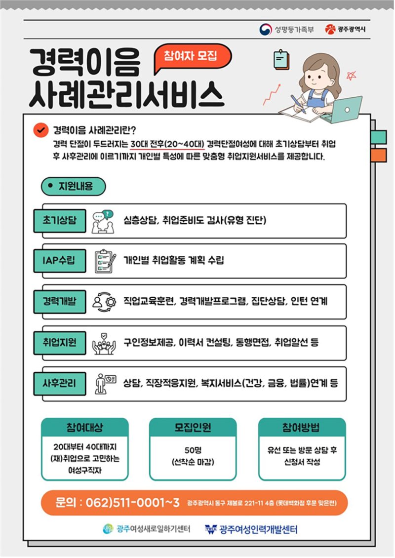 참여를 희망하는 여성은 광주여성인력개발센터를 직접 방문하거나 유선 상담을 통해 신청서를 접수하면 된다.