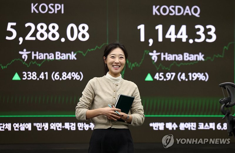 이날 코스피는 전장보다 338.41포인트(6.84%) 오른 5,288.08에 거래를 마감했다. 이날 상승률은 2020년 3월 24일 8.60% 이후 5년 10월여 만에 최고치다.