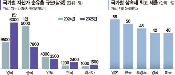 이런 가운데 영국 이민 컨설팅사 헨리앤드파트너스는 연간 한국 고액 자산가들의 해외 유출이 최근 1년간 2배로 급증했다고 발표했다. 한국 고액 자산가 순유출 잠정치는 2024년 1200명에서 2025년 2400명으로 급증하며 영국, 중국, 인도에 이어 세계 4위를 기록했다.