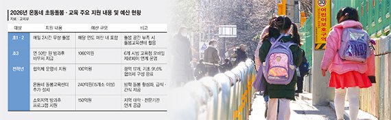 초1·2 무상 돌봄 프로그램은 매일 2시간씩 계속 제공한다. 2025년에는 55만2000여명이 참여해 81.3%의 참여율을 기록했고, 학생 만족도 93.4%, 학부모 만족도 89.4%였다.