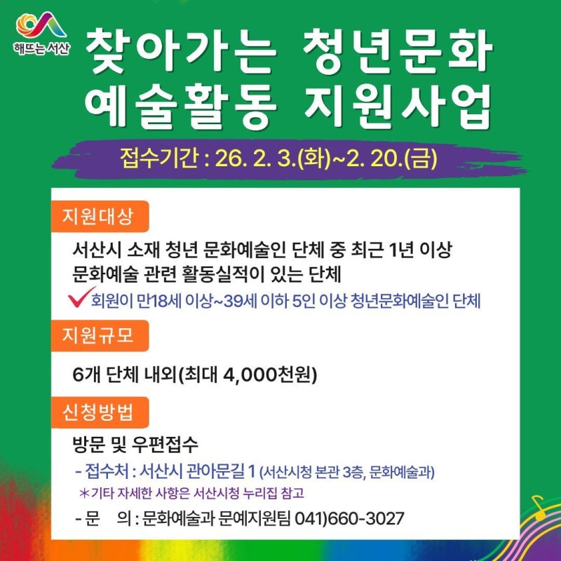 (서산=뉴스1) 김태완 기자 = 충남 서산시는 지역 청년 문화예술 활성화를 위해 오는 2월 20일까지 ‘2026년 찾아가는 청년문화 예술활동 지원사업’에 참여할 단체를 모집한다고 4일 밝혔다.