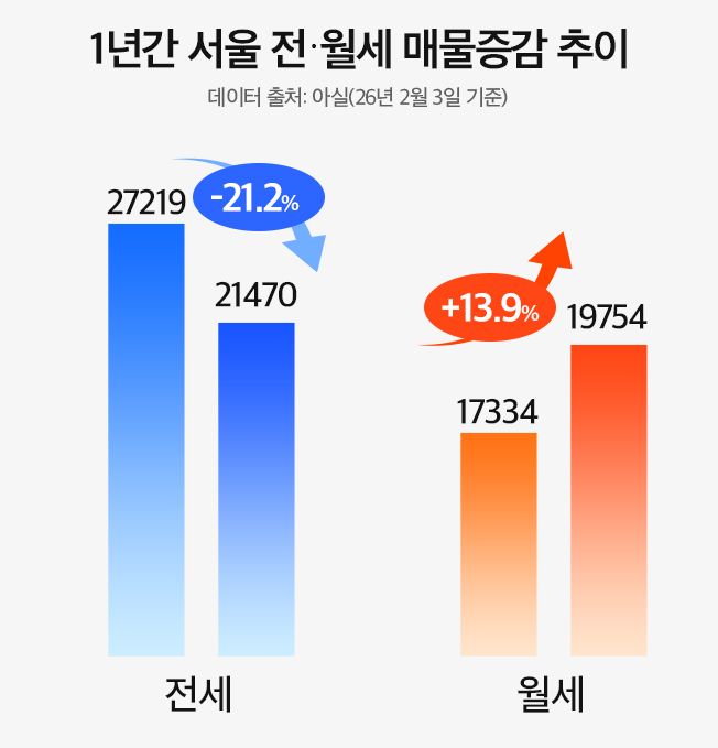 4일 부동산 빅데이터 업체 아실에 따르면 전날인 3일 기준 지난 1년간 서울 아파트 전세 물건은 2만7219건에서 2만1470건으로 약 21.2% 급감했다. 반면 같은 기간 월세 물건은 1만7334건에서 1만9754건으로 13.9% 증가했다. 임대차 시장 전반에서 ‘전세의 월세화’ 현상이 뚜렷하게 나타나고 있는 것이다.