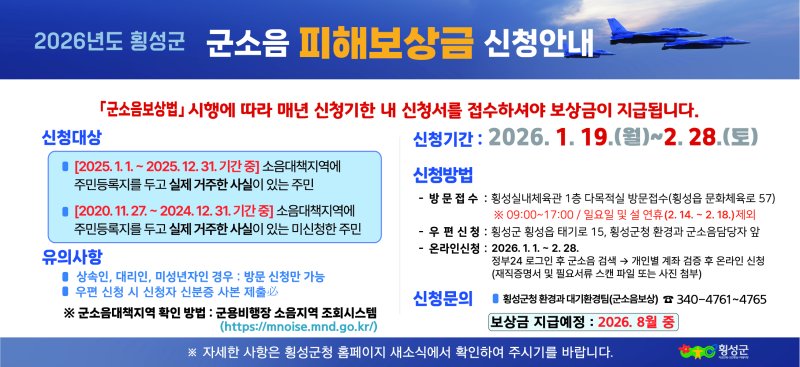 신청 대상은 지난해 동안 소음대책지역인 횡성읍 29개 리에 주민등록을 두고 실제로 거주한 주민이다. 지난해 신청을 놓친 경우도 이번 기간에 소급 신청이 가능하다.