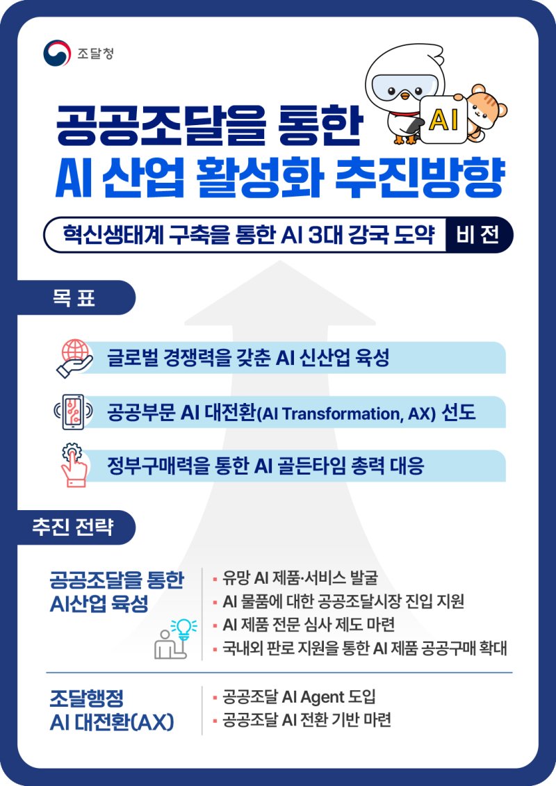 이번 방안은 공공조달을 통한 AI 산업 육성과 조달행정 AI 대전환을 동시에 추진하는 것을 목표로, 공공조달 전 과정을 AI 중심으로 재설계하는 데 중점을 두었다.