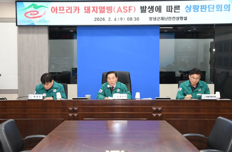 [창녕=뉴시스] 안지율 기자 = 경남 창녕군은 4일 대합면 소재 양돈농가에서 아프리카돼지열병(ASF)이 확인됨에 따라 성낙인 군수 주재 상황판단 회의를 열고 초기 대응 상황 점검과 추가 확산 차단 방안을 집중 논의했다고 밝혔다.