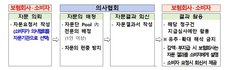 소비자가 보험회사의 자체 의료자문 결과에 이의를 제기하는 경우 상호협의하에 제3의료기관에서 의료자문을 재실시하며, 보험사가 비용은 전액 부담한다.