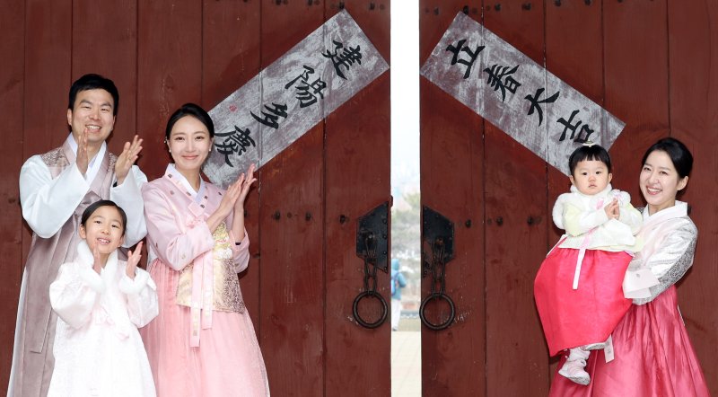 [서울=뉴시스] 조성우 기자 = 절기상 입춘인 4일 오전 서울 중구 남산골한옥마을에서 열린 입춘첩 붙이기 시연 행사에 참여한 1990년생 경오년 말띠인 박민지(오른쪽) 씨와 박은혜 씨가 가족과 함께 '입춘대길·건양다경'이라고 적힌 입춘첩을 붙인 뒤 포즈를 취하고 있다. 2026.02.04. xconfind@newsis.com [서울=뉴시스] 류현주 기자 = 절기상 입춘(立春)인 4일 서울 남산골한옥마을에서 '2026 세시절기 입춘' 행사가 열렸다.