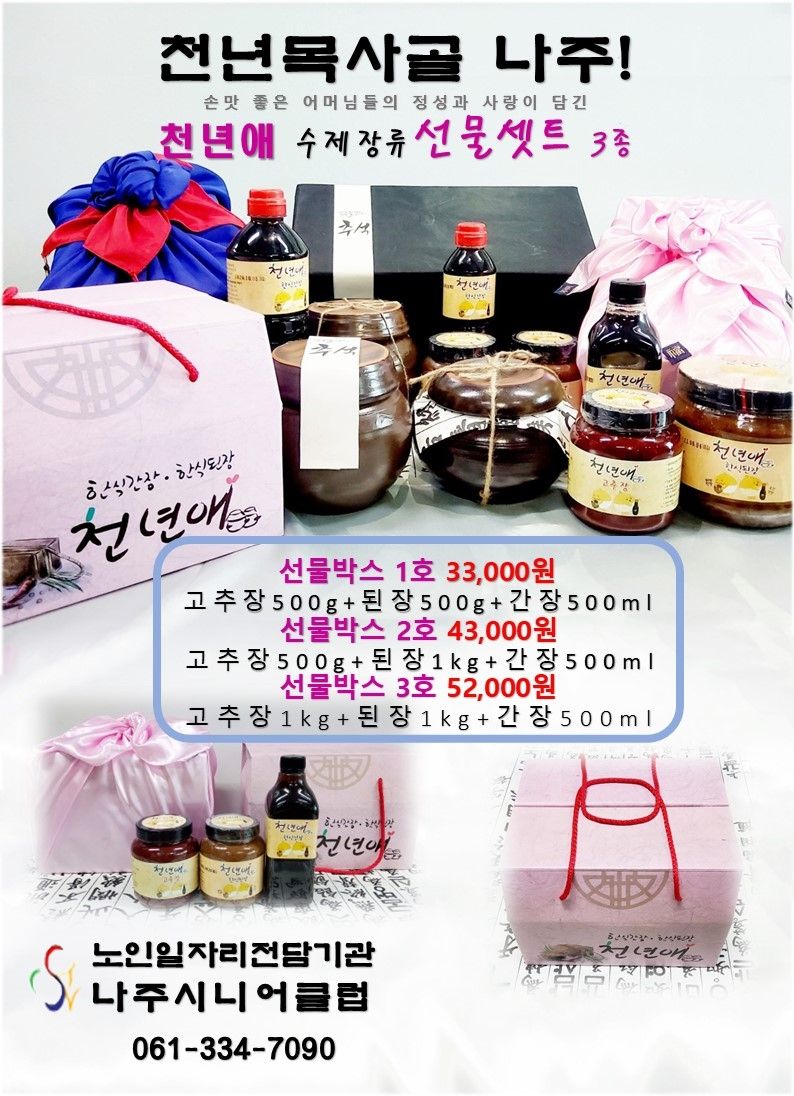 현재 '남도장터'에서 판매하는 노인 일자리 생산품은 △여수시니어클럽 김치류 △순천시니어클럽 손질 멸치·누룽지세트 △곡성시니어클럽 참기름 세트 △고흥시니어클럽 참깨 누룽지 △보성시니어클럽 녹차 기름 세트 △완도시니어클럽 김·유자사과 주스 세트 등이다.