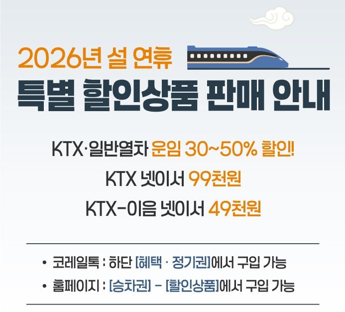[파이낸셜뉴스] 한국철도공사(코레일)가 설 연휴 기간 여유 좌석이 있는 열차를 대상으로 특별 할인상품을 마련해 오는 6일부터 판매한다.