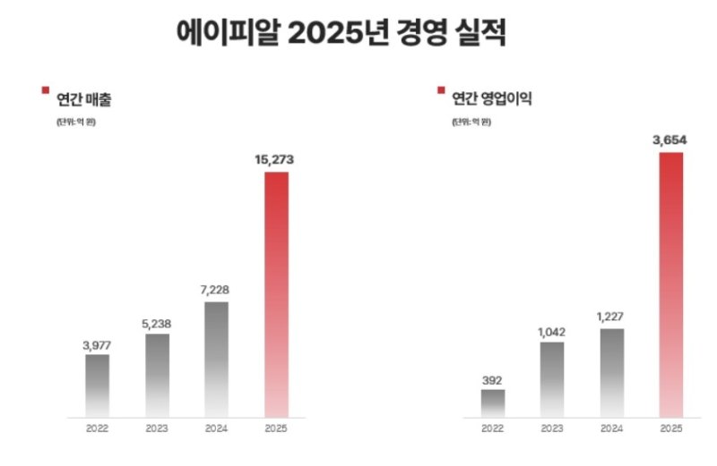 에이피알은 연결 기준 지난해 매출 1조5273억원과 영업이익 3654억원으로 전년 대비 각각 111%, 198% 증가한 것으로 잠정 집계됐다고 4일 밝혔다. 창립 후 11년 연속 성장을 이어간 것이다. 영업이익률은 24%로 수익성도 확대됐다.