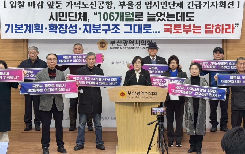 이들은 부산시의회에서 기자회견을 열어 "국토부의 기본계획은 2065년 가덕 신공항 여객 수요를 연간 약 2천300만 명 수준으로 설정하고 있다는데, 김해공항은 2024년 기준 전체 이용객이 2천800만명대에 이른다"면서 "국토부 추계는 가덕 신공항의 위계와 역할을 구조적으로 축소하는 것"이라고 주장했다.