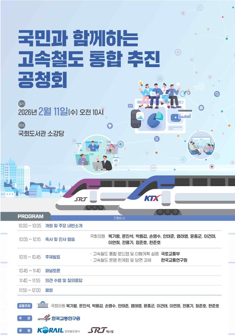 공청회에서는 좌석 공급 확대와 대기시간 단축 효과, 예매·환승·열차 변경 개선 방안 등 고속철도 통합 실행 방안을 중심으로 주제 발표와 패널 토론이 진행될 예정이다.