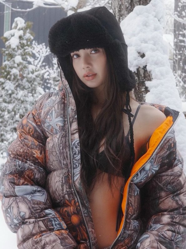 사진 속 리사는 비키니 수영복 위에 패딩 점퍼만 걸친 채 포즈를 취한 모습이다. 눈이 내린 추운 날씨지만 파격 스타일링으로 노출한 모습이 인상적이다.