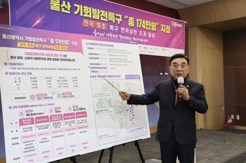 김두겸 울산시장은 4일 울산시청 프레스센터에서 기자회견을 열어 산업통상부가 5일 고시를 통해 울산지역 154만2천990㎡(46만6천평)를 기회발전특구로 추가 지정한다고 밝혔다.