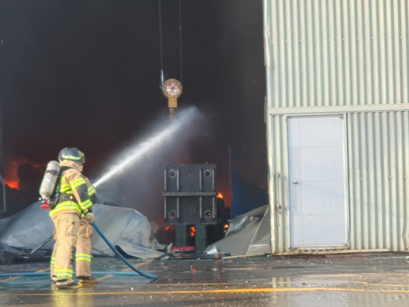 (울산=뉴스1) 김세은 기자 = 4일 오후 4시 23분께 울산 울주군 온산읍 화산리의 한 에너지장치 제조 공장 내 보온 자재 창고에서 불이 나 진압 중이다.