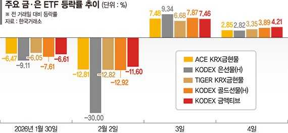 금·은 가격이 회복세를 보이면서 관련 상장지수펀드(ETF)도 강세를 보였다. 이날 'ACE KRX금현물'은 2.85%, 'KODEX 은선물(H)'은 2.82%, 'TIGER KRX금현물'은 3.35%, 'KODEX 골드선물(H)'은 3.89%, 'KODEX 금액티브'는 4.21% 올랐다. 전날에도 'ACE KRX금현물'(7.48%), 'KODEX 은선물(H)'(9.34%), 'TIGER KRX금현물'(6.68%), 'KODEX 골드선물(H)'(7.87%), 'KODEX 금액티브'(7.46%) 등이 줄줄이 급등했다.