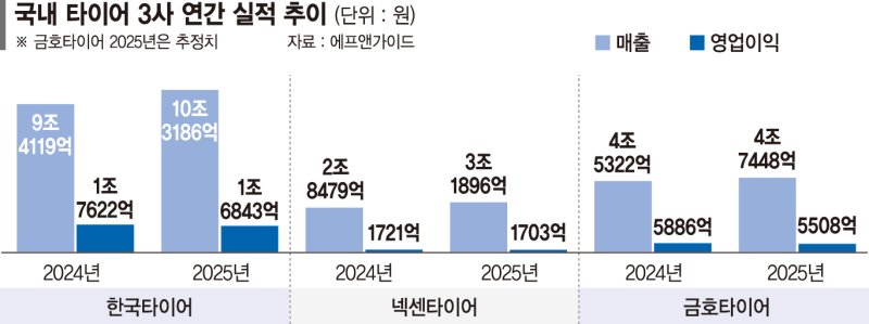 이에 금호타이어까지 합친 국내 타이어 3사의 올해 합산 매출은 18조2530억원에 달할 것으로 전망된다. 전년(16조7921억원)대비 8.7% 늘어난 수치이자 역대 최고 기록이다. 에프앤가이드에 따르면 오는 6일 실적발표를 앞둔 금호타이어의 지난해 연간 매출은 4조7448억원으로 예측된다. 전년(4조5322억원) 대비 4.7% 증가한 수치다.