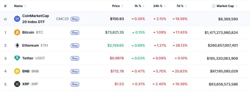 5일 오전 5시 현재 글로벌 코인 시황 중계사이트 코인마켓캡에서 비트코인은 24시간 전보다 1.09% 하락한 7만3621달러를 기록하고 있다. 비트코인은 한때 7만2138달러까지 떨어져 7만3000달러가 붕괴했었다.