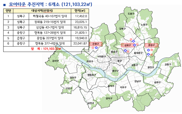 [파이낸셜뉴스] 서울시는 지난 4일 열린 제2차 도시계획위원회에서 주민제안 모아타운 신규 신청지역 6곳(성북구 3곳, 중랑구 2곳, 은평구 1곳)의 지목 도로를 토지거래허가구역으로 신규 지정했다고 5일 밝혔다. 지정 기간은 오는 17일부터 2031년 2월 16일까지 5년 간이다.