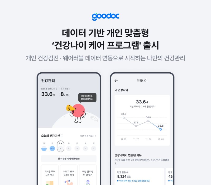 병원 진료 접수·예약 및 비대면진료 플랫폼 굿닥은 개인 건강 데이터를 기반으로 일상 속 맞춤형 건강관리를 지원하는 '건강나이 케어 프로그램' 베타 버전을 선보였다고 5일 밝혔다.