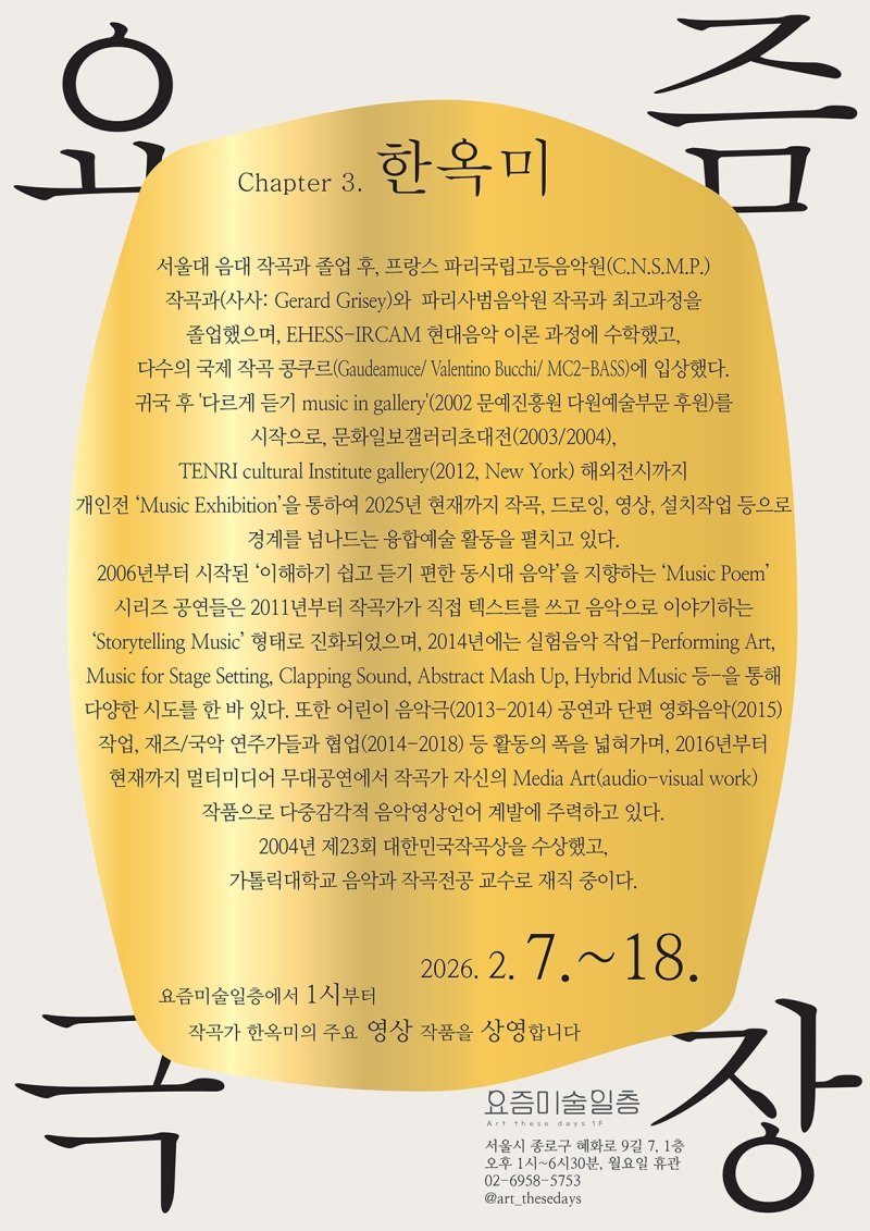 가톨릭대학교 음악과 교수로 재직하며 후학 양성과 창작 활동을 병행하고 있는 한옥미는 이번 전시를 통해 '다르게 듣기'와 '보기'의 경험을 선사한다. 관람객은 단순히 음악을 청취하는 것을 넘어, 소리가 영상과 설치라는 매개체를 통해 어떻게 공간 속에 안착하고 확장되는지 체험하게 된다.