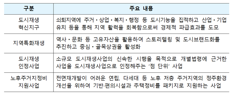 국토부가 지원하는 도시재생사업은 △도시재생혁신지구 △지역특화재생 △인정사업 △노후주거지정비 지원사업 4가지로 나뉘며, 모든 유형의 사업을 신규 선정한다.