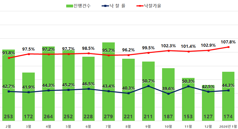 5일 경·공매 데이터 전문기업 지지옥션이 발표한 경매동향보고서에 따르면, 1월 전국 아파트 경매 진행건수는 3033건으로 전월(2989건) 대비 1.5% 증가했다. 낙찰률은 37.5%로 전월(34.5%)보다 3.0%p 상승했다. 낙찰가율은 전월(87.0%) 대비 1.8%p 오른 88.8%를 기록하며 2022년 7월(90.6%) 이후 3년 6개월 만에 최고 수준을 보였다.